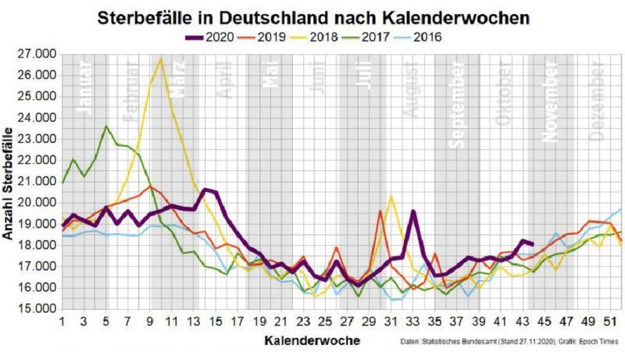 Op zijn laatst sinds de tweede lockdown rijst de vraag: Hoe erg is de Coronapandemie eigenlijk? Hoe dodelijk is Covid-19? En, zou men kunnen denken, als er elke dag duizenden mensen sterven, wat zal er dan met de Duitse bevolking gebeuren? Tot zo ver: volgens het Federaal Bureau voor de Statistiek is er geen oversterfte. Tot en met 31 oktober 2020 vielen er niet meer doden dan in de twee voorgaande jaren, schrijft Epoch Times.