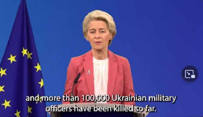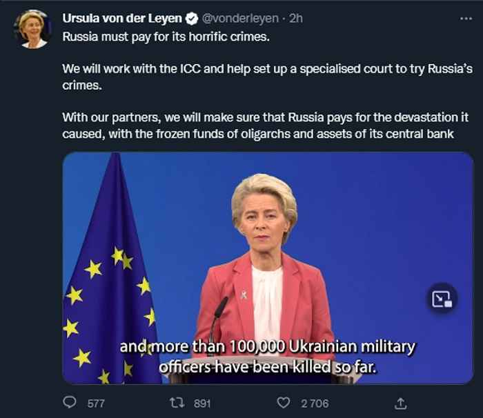 Onmiddellijk na haar verklaring verwijderde Ursula von der Leyen snel de tweet die ze had geplaatst en bracht een nieuwe video uit zonder de verwijzing naar het aantal dode Oekraïners.