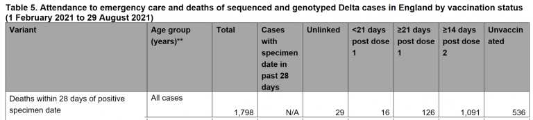 Uit de op 3 september 2021 gepubliceerde gegevens van Public Health England blijkt dat er vanaf 1 februari 2021 tot en met 29 augustus 2021 1.798 sterfgevallen zijn geweest binnen 28 dagen na een positieve test op de Delta Covid-19-variant.