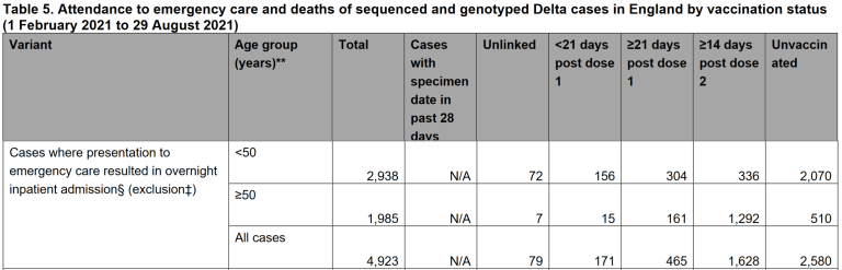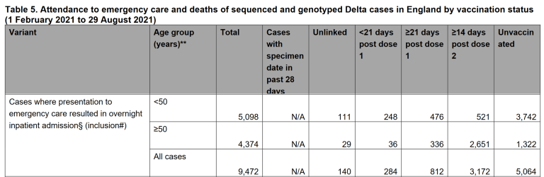 “Van de 5.098 mensen onder de 50 jaar waren er 3.742 (73%) niet gevaccineerd, 724 (14%) hadden één dosis van een COVID-19-vaccin ontvangen en 521 (10%) hadden beide doses ontvangen.” – Sky News 03 september 2021
