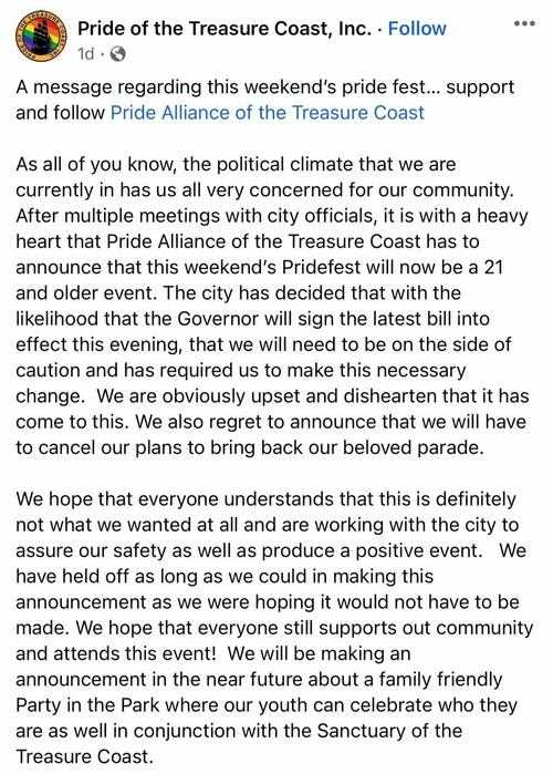 De staatswetgever heeft namelijk in een nieuwe richtlijn (die nog door gouverneur Ron DeSantis moet worden ondertekend) verklaard dat vanwege het geseksualiseerde karakter van dergelijke evenementen een minimumleeftijd van 21 jaar geldt voor deelnemers. De stad Port St. Lucie keurde de parade van deze “Pride Alliance” juist onder deze voorwaarden anticiperend goed, waarop de LGBT-organisatie verklaarde dit evenement niet langer te willen houden.