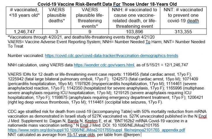 De gegevens van de VAERS-databank laten 3 sterfgevallen en 9 levensbedreigende gevallen zien bij iets meer dan 1,2 miljoen gevaccineerden onder de 18. Hieruit wordt het Number Needed to Harm (NNH), of het aantal vaccinaties waarbij sterfgevallen of levensbedreigende ongewenste voorvallen optreden, juist hier berekend op 103.896.