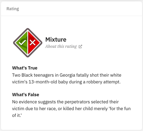 In 2013 schoten ze een 13 maanden jonge blanke baby in het gezicht. En het zelfde narratief ging toen ook al rond. Snopes heeft er een pagina over, waarin ze uitleggen aan de witmens dat de tieners de baby niet hebben gedood omdat hij blank was, en eigenlijk “een poging tot overval” was.