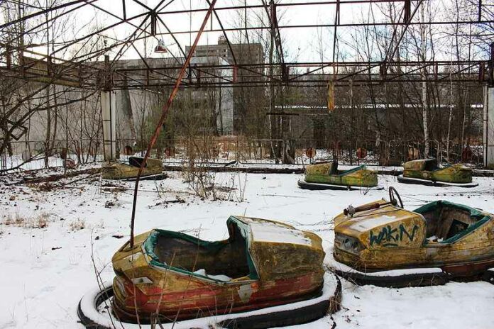 Poppen en kinderkleren lagen verspreid op stoffige vloerplanken. In één kamer van een somber flatgebouw uit het Sovjettijdperk dat aan een tiener toebehoorde, hangt een Metallica poster aan de muur. Winkelwagentjes staan te roesten in wat nog steeds een kruidenierswinkel lijkt. Op een recreatieplek zijn de stangen die de botsauto’s aan het plafond bevestigen ook bedekt met roest, net als de botsauto’s zelf.
