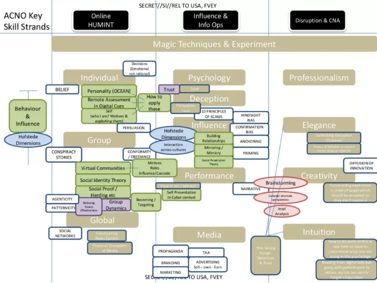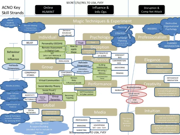 Een van de documenten die Edward Snowden vrijgaf, was een diapresentatie met de titel “The Art of Deception: Training for Online Covert Operations.” Hierin spreekt de JTRIG openlijk over het opbouwen van zogenaamde “cybermagiërs” die “toveren met informatie” door middel van formele training bedoeld om “geaccrediteerde computernetwerkbeheerders” (ACNO) te produceren – moderne informatiestrijders. Voor degenen die vraagtekens zetten bij de reikwijdte en omvang van mogelijke informatieoperaties die kunnen worden uitgevoerd tegen onwetende doelwitten, biedt het JTRIG trainingsdocument drie dia’s die, wanneer ze achter elkaar worden bekeken, laten zien hoe “cybermagiërs” zoals degenen die toezicht zouden houden op de bewapening van Gonzalo Lira hun operationele ruimte vormgeven.