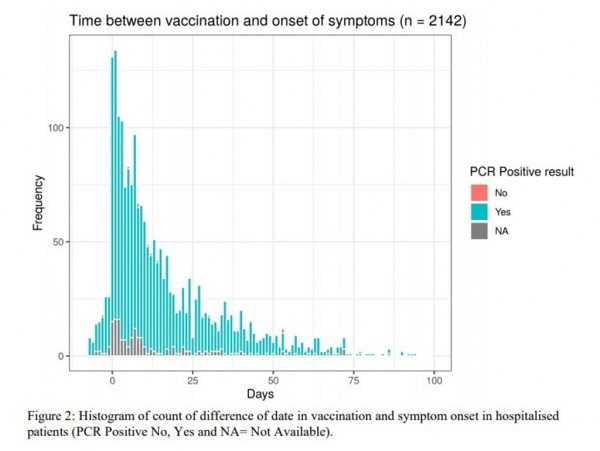 De onderzoekers stelden vast dat de gemiddelde tijd tussen de eerste vaccinatie en het optreden van de symptomen negen dagen bedroeg. Aangezien de gemiddelde tijd tussen de infectie en het begin van de symptomen vijf dagen bedraagt, suggereert dit dat het merendeel van de patiënten de ziekte opliep in de dagen na de vaccinatie.