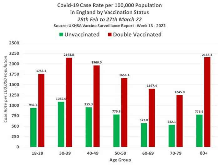 De grafiek hieronder, gemaakt door de Daily Expose,14 gebruik makend van gegevens uit het UKHSA Vaccine Surveillance Report voor week 13, 2022,15 (blz. 40 en 45), laat zien wie meer kans heeft om COVID te krijgen. En het besmettingspercentage voor drievoudig gevaccineerden is nog hoger dan voor dubbel gevaccineerden.