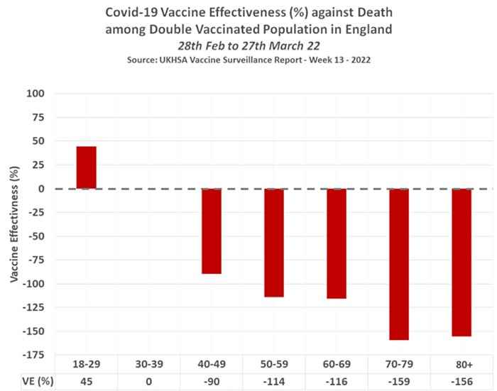 Alle dubbel gevaccineerden boven de 40 jaar hebben tussen de 2 en 3 keer meer kans om aan COVID-19 te sterven, met een vaccineffectiviteit van min-90% bij de 30- tot 39-jarigen, en een vaccineffectiviteit van min-156% bij de 80-plussers.”