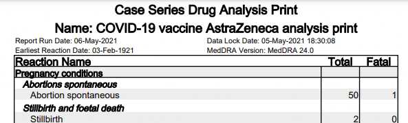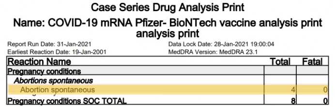 Het is vanwege dit advies van de Britse regering dat wij zo geschokt waren om in het eerste vrijgegeven rapport van bijwerkingen van de Covid-vaccins te zien dat, gebruikmakend van gegevens die waren ingevoerd in het MHRA Yellow Card-systeem tot 24 januari 2021, in totaal 4 vrouwen een miskraam hadden gekregen als gevolg van het Pfizer/BioNTech-vaccin.