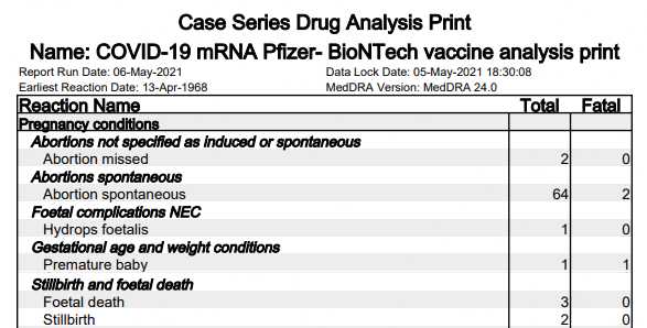 Volgens het vijftiende verslag dat door de Britse regering is uitgebracht over de bijwerkingen van de Covid-vaccins, waarbij gebruik is gemaakt van de gegevens die tot 5 mei 2021 in het Yellow Card-systeem van de MHRA zijn ingevoerd, is het aantal vrouwen dat hun ongeboren/pasgeboren kind heeft verloren nadat zij het Pfizer-vaccin hadden gekregen, sinds 24 januari met 1.700% gestegen. Het totale aantal miskramen staat nu op 66, naast 1 melding van vroegtijdige babysterfte, 3 meldingen van foetale sterfte en 2 meldingen van doodgeboorte. Dit is verwoestend.