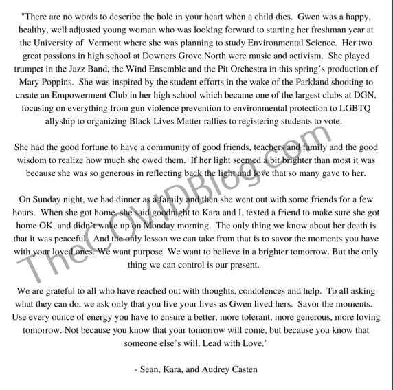 Gwen Casten ging op zondagavond 12 juni uit met vrienden. Zij kwam thuis, zei haar ouders goedenacht, en ging naar bed. Gwen is nooit meer wakker geworden. Zij stierf die nacht in haar slaap. Haar ouders vonden haar dood op de ochtend van 13 juni.