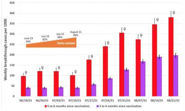 Ondertussen zijn een paar miljard mensen geïnjecteerd met stoffen die in wezen niet doen wat ons verteld is dat ze zouden doen. Wat betreft de effectiviteit tegen ziekenhuisopname, die is op zijn best duister. Bijvoorbeeld omdat in de VS vanaf 7 augustus 60% van de ziekenhuisopnames plaatsvonden onder volledig gevaccineerde personen. Maar bescherming tegen ernstige ziekten is het laatste been waar de vaccinfanatici op kunnen staan, en ze zullen dat been beschermen met alles wat ze hebben. Totdat ze het niet meer kunnen.