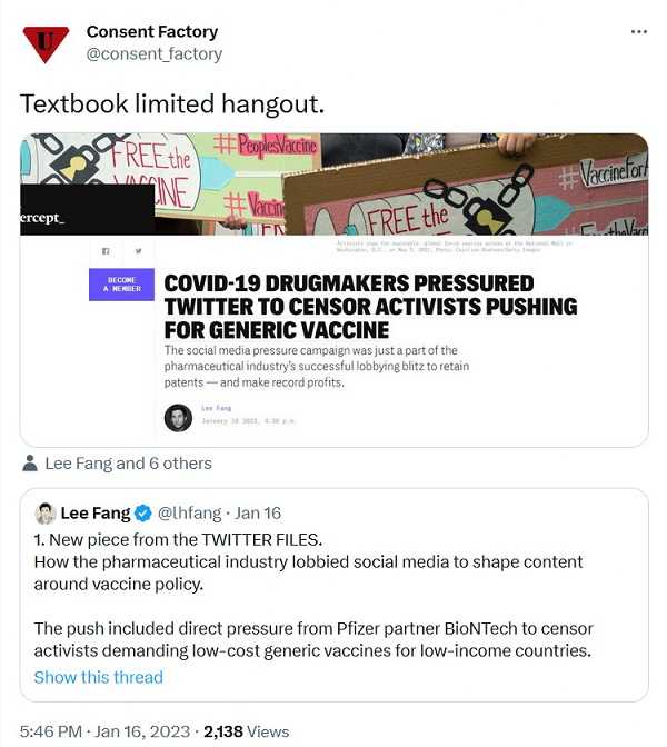 Ik suggereer niet dat Lee Fang, of een van de andere “Covid Twitter Files” journalisten, of degenen die hen helpen promoten, “gecontroleerde oppositie” zijn of iets dergelijks paranoïde (en onnozel). De meest effectieve PSYOPs werken niet op die manier. Journalisten als Fang hoeven niet verteld te worden waarover ze wel en niet mogen berichten. Dat weten ze instinctief. Als ze dat niet wisten, zouden ze niet zijn wie ze zijn en doen wat ze doen. Lee Fang, bijvoorbeeld, is miljonair en werkt voor Pierre Omidyar.