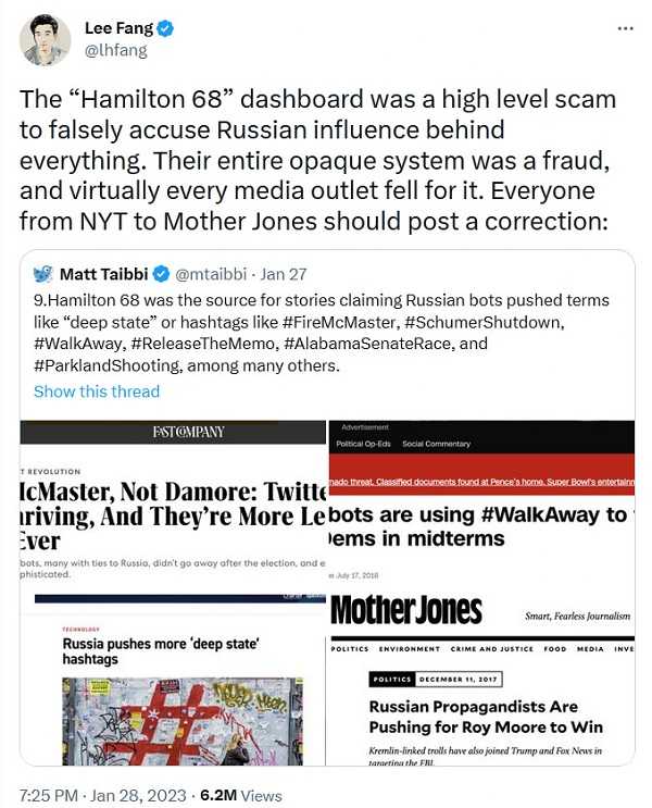 Nogmaals, de tweet van Fang heeft niets te maken met de Covid-PSYOP of de “Covid Twitter Files.” Het is gewoon een voorbeeld van hoe het systeem werkt. Zelfs in het “Hamilton 68” verhaal zijn er bepaalde lijnen die niet kunnen worden overschreden. De bedrijfs- en staatsmedia en de zogenaamde “papers of record” kunnen worden afgeschilderd als “dom”, “slordig”, “incompetent” en zelfs “onethisch” en “gedreven door hebzucht”, maar ze kunnen niet worden afgeschilderd als het propaganda-apparaat van een supranationaal mondiaal kapitalistisch systeem, een apparaat dat perfect functioneert, want dat zou klinken als een “complottheorie”.