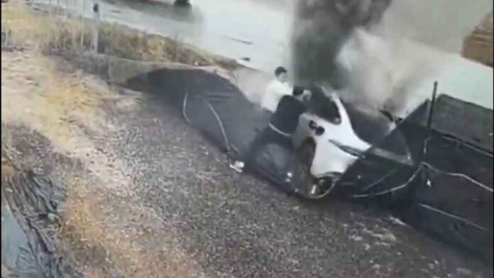 Zoals duidelijk te zien is, vat de elektrische auto binnen enkele seconden vlam. Zonder de hulp van omstanders zouden de passagiers op de achterbank binnen de kortste keren zijn verbrand als gevolg van het thermisch doorbranden van de accu’s.