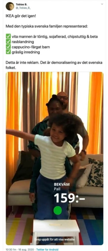 “IKEA het weer doet! Met de typische Zweedse familie vertegenwoordigd: Blanke mannen zijn sukkels, gesojafeerd, chipssnoetjes, cappuccinokleurig kind, gruwelijk decor. Dit is geen reclame. Het is de demoralisatie van het Zweedse volk”.