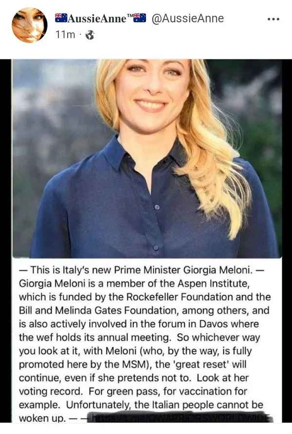 In een recent substack-artikel werd Italië’s nieuwe premier Giorgia Meloni voorgesteld als een antiglobalistische kruisvaarder die een fervent voorstander is van familiewaarden en nationale soevereiniteit: Italy’s New Anti-One World Government Prime Minister Is Being Branded A “Fascist”.