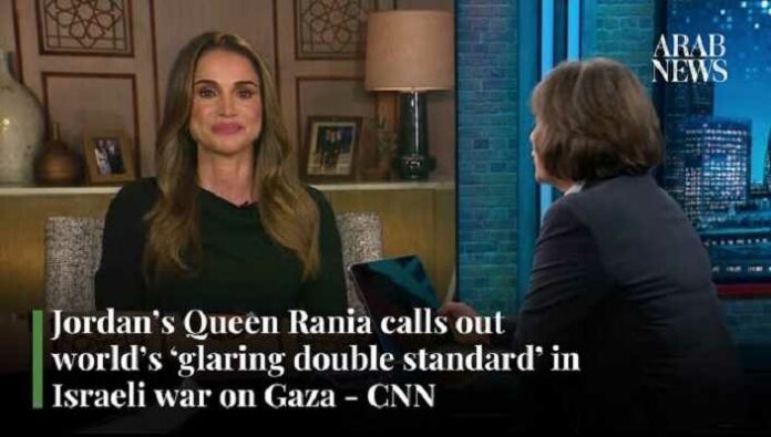 In het interview met de ervaren CNN verslaggeefster Christiane Amanpour gisteravond, zei koningin Rania – wier ouders van Palestijnse afkomst zijn maar die opgroeide in Koeweit – dat er een “flagrante dubbele standaard” in de wereld was als het ging om sympathie voor de slachtoffers van de oorlog.