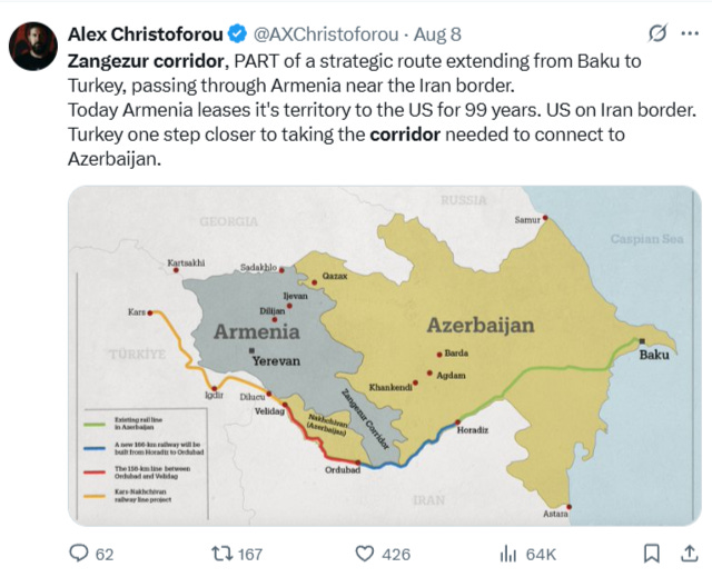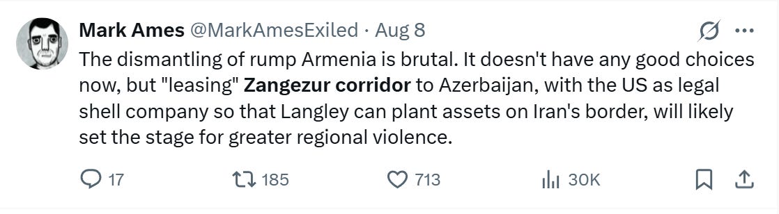 Dit verwijst natuurlijk naar de val van Syrië en de nieuw waargenomen overwicht van Azerbeidzjan op Armenië, waardoor de VS-Israëlische hydra manoeuvres kan beginnen om een wurggreep te krijgen. Dit heeft geleid tot een recent versmalde focus op de Zangezur-corridor, waar Armenië zojuist een 99-jarige leaseovereenkomst met de VS heeft getekend:
