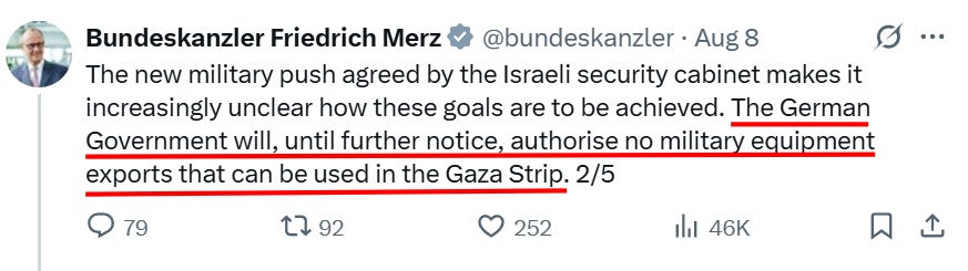 Vervolgens is er het feit dat meerdere wereldleiders genoeg hebben van Bibi. Macron kondigde aan dat Frankrijk Palestina officieel zal erkennen tijdens de komende VN-top in september. Andere grote landen volgden, waaronder Australië, dat ook aankondigde tegelijkertijd de erkenning bekend te maken. Ondertussen nam bondskanselier Merz de ongekende stap om alle wapenleveranties aan Israël stop te zetten, tenzij Netanyahu de operatie in Gaza staakt:
