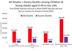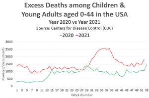 Volgens de gegevens was er een lichte stijging van het aantal sterfgevallen onder kinderen en jonge volwassenen toen de eerste lockdowns van start gingen. Toen de Covid-19 vaccins in 2021 werden geïntroduceerd, zou het sterftecijfer aanzienlijk gedaald moeten zijn. De tegenovergestelde realiteit deed zich echter voor. Het sterftecijfer voor 2021 was 38 van de 40 weken hoger dan in 2020. Tegen week 31 van 2021 steeg het sterftecijfer zelfs nog sterker, en het bleef astronomisch hoog voor de eerste helft van 2022.