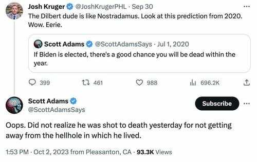 Kruger bespotte vaak conservatieven op X en noemde Dilbert-bedenker Scott Adams op zaterdag ironisch genoeg “Nostradamus” omdat hij voorspelde dat mensen “binnen het jaar” na de verkiezing van Biden dood zouden zijn.