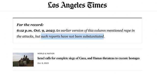 “In een eerdere versie van deze column werd melding gemaakt van verkrachting bij de aanvallen [gepleegd door Hamas], maar dergelijke berichten zijn niet onderbouwd,” aldus de LA Times.