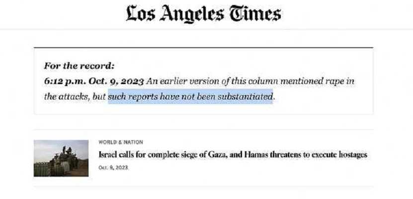 “In een eerdere versie van deze column werd melding gemaakt van verkrachting bij de aanvallen [gepleegd door Hamas], maar dergelijke berichten zijn niet onderbouwd,” aldus de LA Times.