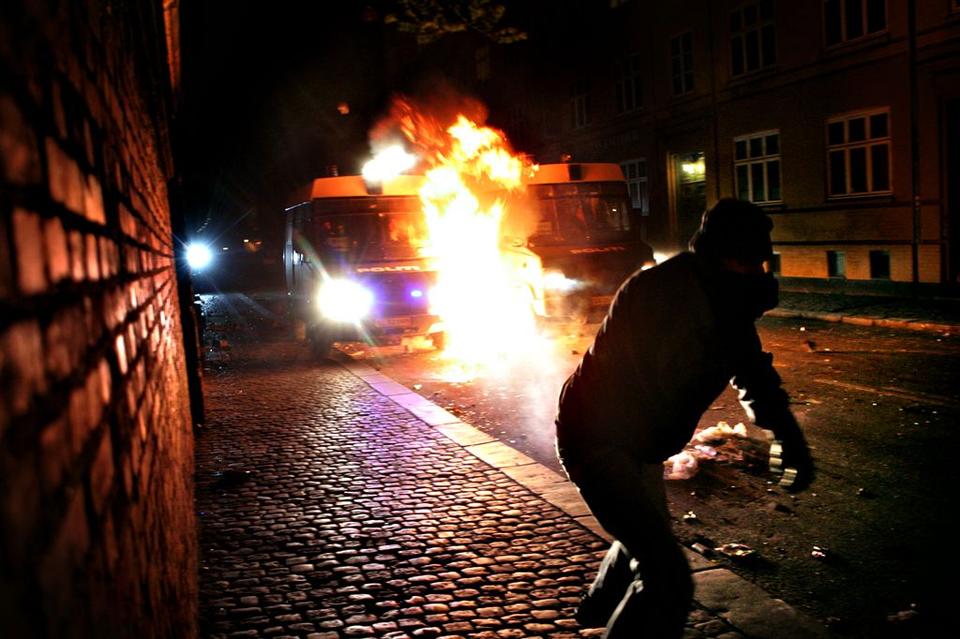 Foto: Demonstrant gooit molotovcocktail naar een politiebusje in Christiana, Denemarken © w:User:Silkepølse / Wikimedia (GNU)
