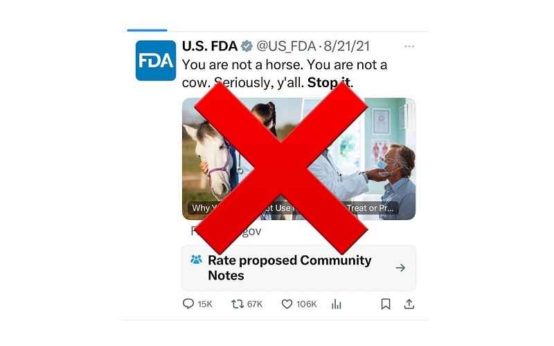 De FDA moet ook verschillende berichten op social media verwijderen waarin wordt gepleit tegen het gebruik van Ivermectine, waaronder een bericht met de tekst “Je bent geen paard. Je bent geen koe. Stop ermee, stop ermee.”