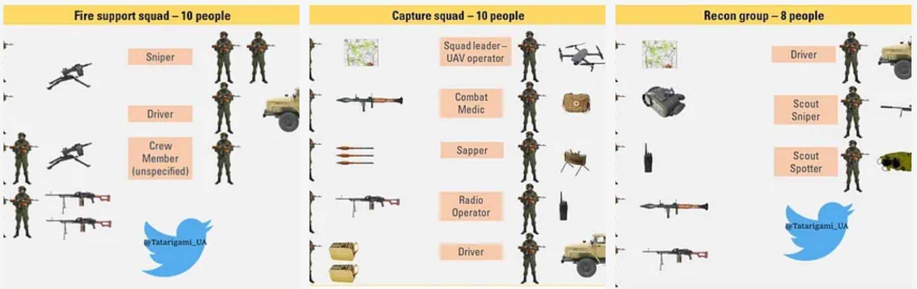 Ten derde brengt hij de recente trend ter sprake, waarover ik uitgebreid heb geschreven in het eerder geplaatste artikel over BTG’s, dat Rusland overschakelt op tactieken met kleine eenheden, gericht op aanvals-/schokeenheden die gespecialiseerd zijn in het bestormen van vestingwerken en loopgraven. Hij verwijst naar het Twitteraccount van de Oekraïense reserveofficier die ik eveneens in mijn bericht heb gebruikt, en die uitvoerig heeft geschreven over het zogenaamde “buitgemaakte Russische veldhandboek” waarin de nieuwe soorten Russische aanvalseenheden en hun configuraties worden beschreven. We komen zo terug op de UA-officier.