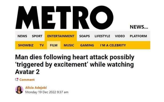 Wij hebben reikhalzend uitgekeken naar deze verklaring voor plotselinge en onverwachte sterfgevallen. Wie in de bioscoop dood neervalt, heeft in geen geval een boosterprik teveel genomen. Nee, hij was zo blij dat de film “Avatar 2” zo goed was dat de hartaanval vrijwel onvermijdelijk was. Na vreugde over goede schoolcijfers, te koud of te warm baden, klimaatverandering en vergeten te ademen tijdens het sneeuwschuiven, klinkt dat vrij aannemelijk, nietwaar? bericht Report24.news.
