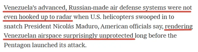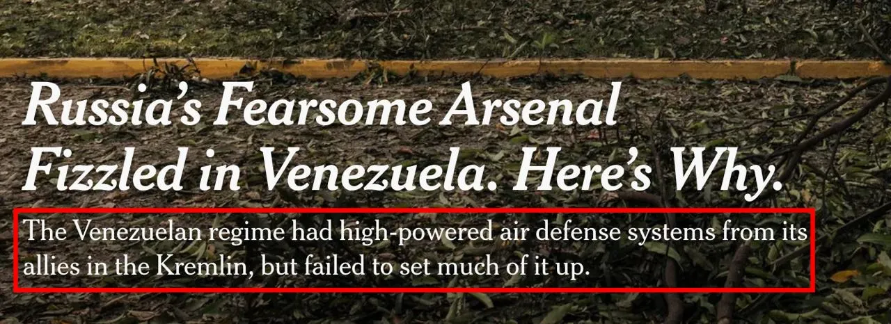 Als laatste opmerkelijke update is er vandaag nog meer bevestigend nieuws van de NYT, dat de theorieën over het feit dat de luchtverdediging van Venezuela in wezen niet bestond tijdens Trumps “meesterlijke” aanval op Maduro verder bevestigt: