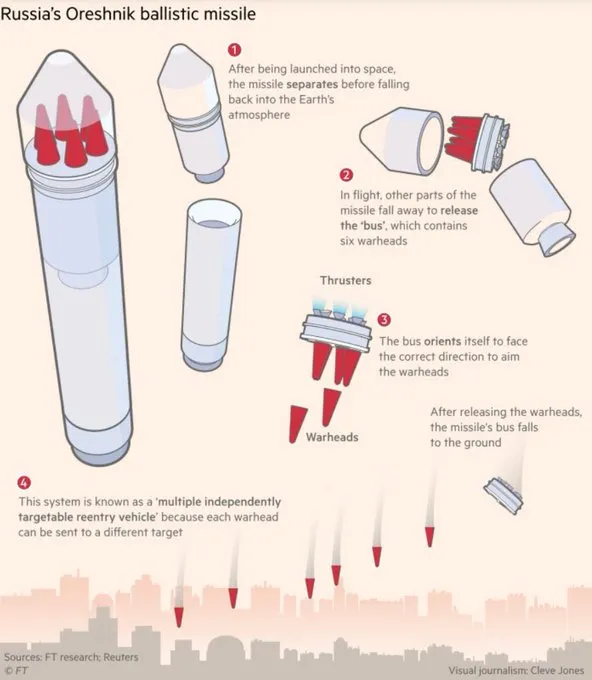 - De Oreshnik is in feite een MaRV-systeem, waarbij de bus zelf gebruikmaakt van verouderde technologie, maar de Maneuverable Re-entry Vehicles beschikken over geavanceerde zelfgeleidings- en voortstuwingsmechanismen waarmee ze zelfstandig het doel kunnen bereiken.