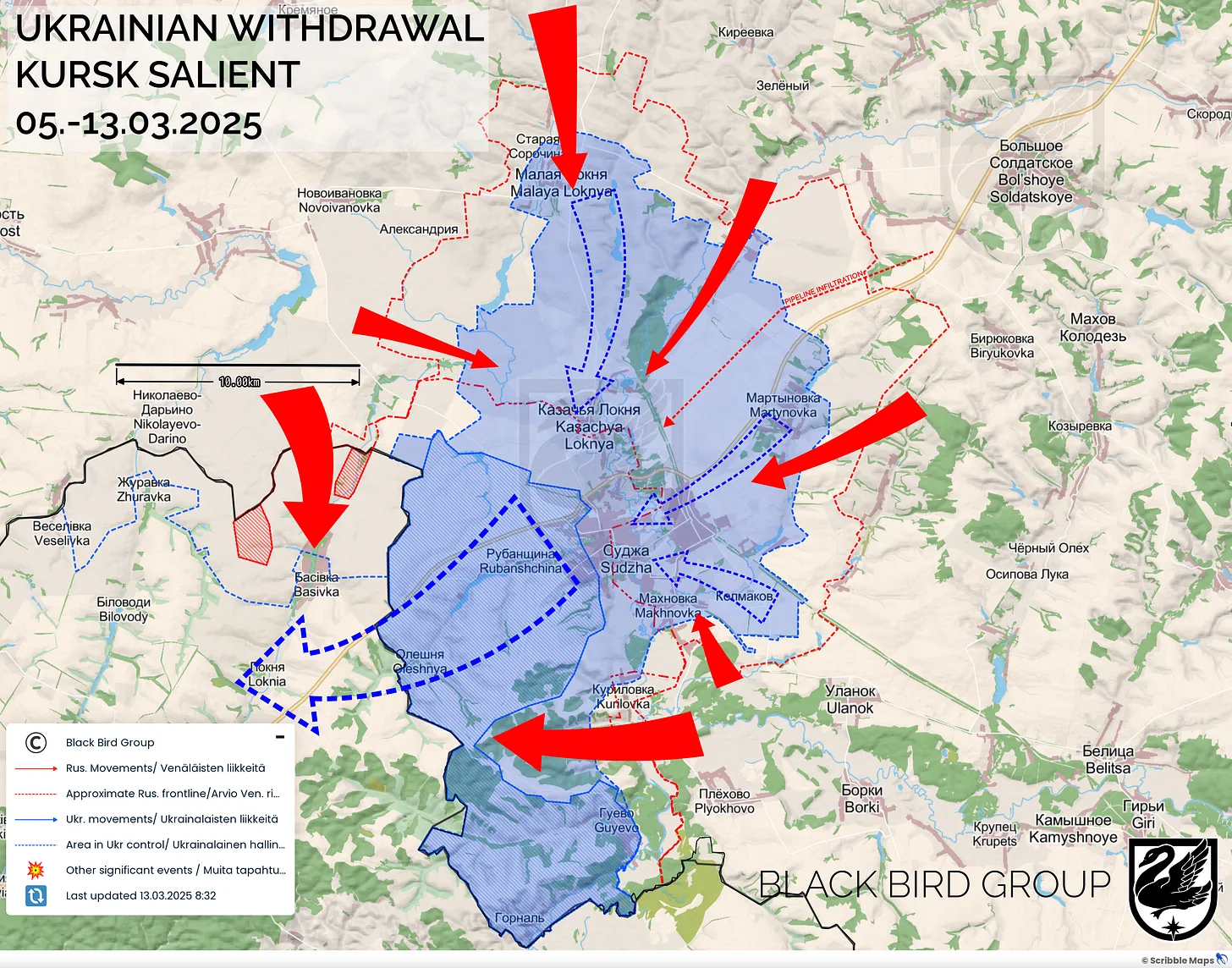 Op 11 maart hadden de Russen echter Kazachya Loknaya veroverd en op 12 maart werden de Russen gefilmd met vlaggen in het centrum van Sudzha. Ondanks de officiële Oekraïense beweringen dat de Oekraïense strijdkrachten Koersk niet zouden verlaten, was de salient aan het eind van 13 maart praktisch verdwenen, waardoor er nog enkele vierkante kilometers in Oekraïense handen waren. De gevechten in de buitenwijken van Sudzha en de grensdorpen zullen waarschijnlijk nog enige tijd doorgaan, terwijl de Russen de operatie afronden.