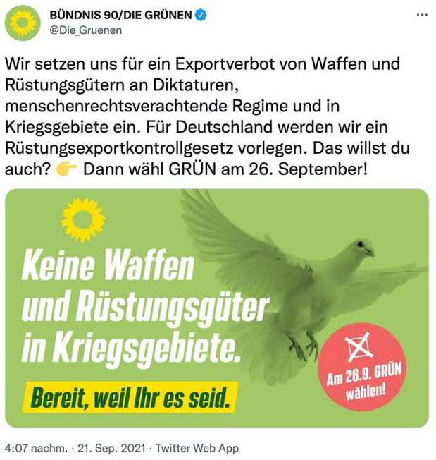 Met de hulp van de links-groene mainstream media zijn de “Groenen” erin geslaagd het beeld te scheppen van vreedzame lammetjes die alleen het beste voor hebben met de mensheid en de natuur. Nauwelijks waren zij in de regering, of zij rukten hun eigen pacifistische larven af – en nu komt de gruwelijke grimas van bloeddorstige oorlogszuchtigen aan het licht. Tot nu toe was hun slogan “Vrede stichten zonder wapens”, maar nu is het “Vrede stichten met zware wapens”. En dat ondanks het feit dat zij weten dat militaire steun deze oorlog alleen maar zal verlengen en nog meer doden zal veroorzaken.