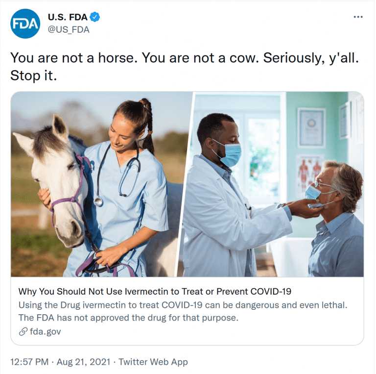 Zet dit in contrast met de tweet van de FDA van een paar dagen geleden waarin werd verklaard: “Je bent geen paard”, waarbij de suggestie wordt gewekt dat de enige mensen die vandaag op zoek zijn naar Ivermectine, degenen zijn die ten onrechte denken dat ze grote boerderijdieren zijn.