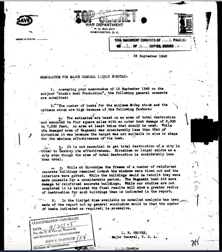 Volgens een geheim (geclassificeerd) document van 15 september 1945, “had het Pentagon overwogen om de Sovjet-Unie op te blazen met een gecoördineerde nucleaire aanval gericht tegen grote stedelijke gebieden.”
