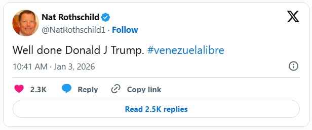 Nat Rothschild — CEO van de Volta Group en een prominente erfgenaam van het financiële imperium van Rothschild — feliciteerde Trump na de militaire actie van de VS tegen de regering en het financiële systeem van Venezuela, schrijft Baxter Dmitry.