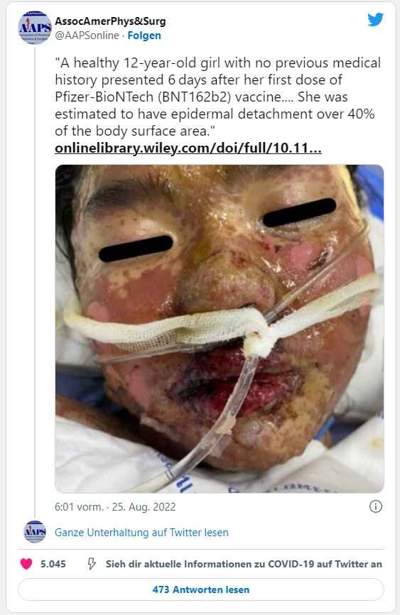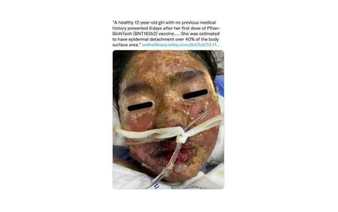 Een gezond twaalfjarig meisje uit Thailand, dat geen onderliggende ziekten had, kreeg twee dagen na haar eerste vaccinatie met Pfizer koorts en keelpijn. Op de zesde dag na de vaccinatie verschenen er zweertjes op haar borst en die verspreidden zich naar haar gezicht, handpalmen en voetzolen.