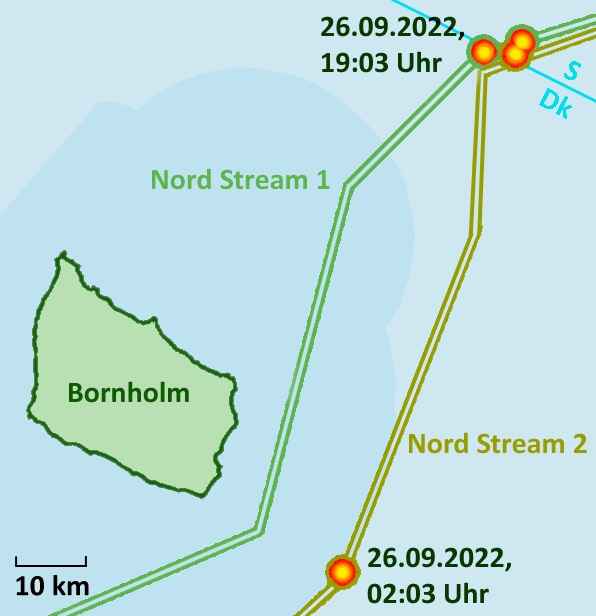 Op 26 september meldde de Nord Stream 2 pijpleiding een enorme drukdaling. De volgende dag meldde de Nord Stream 1 pijpleiding hetzelfde. Een Deens gevechtsvliegtuig, dat over de route van de pijpleiding vloog, meldde dat het een verstoring met een diameter van één kilometer zag in het water bij het eiland Bornholm, direct boven de Nord Stream 2 pijpleiding, veroorzaakt door het massaal vrijkomen van aardgas onder water. (De Deense autoriteiten schatten dat er tussen de twee pijpleidingen in totaal ongeveer 500.000 ton methaan in de atmosfeer is vrijgekomen).