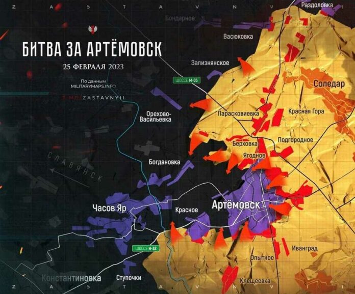 Hier zijn een paar fotokaarten met de huidige positie van de Russische en Oekraïense troepen in Bakhmut en omgeving. Zoals u kunt zien vorderen de Russen (d.w.z. de Wagner Group) snel na maanden van trage vooruitgang en lijken ze op het punt te staan de Oekraïense eenheden tactisch te omsingelen, schrijft Larry Johnson.