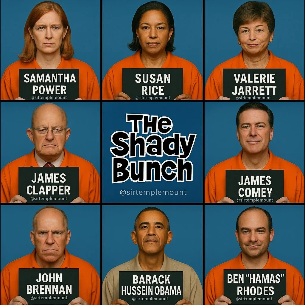 Hij plaatste ook nep-mugshots van Obama en zijn naaste medewerkers in oranje gevangenisoveralls onder de titel “The Shady Bunch”, een parodie op The Brady Bunch. Die was eigenlijk best grappig.