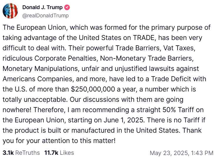 De Amerikaanse president Donald Trump heeft vandaag op 23 mei gezegd dat de Verenigde Staten binnenkort een invoerheffing van 50 procent zullen opleggen aan de Europese Unie.