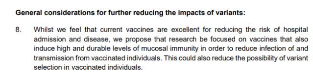 Het werd onlangs ook bevestigd door SAGE zelf in een rapport voor de Britse regering dat op 26 juli 2021 werd gepubliceerd, getiteld “Long term evolution of SARS-CoV-2“, waarin het verklaarde dat vaccins de infectie bij de meeste mensen niet volledig voorkomen en dat het onderzoek moet worden gericht op vaccins die infectie en transmissie verminderen.