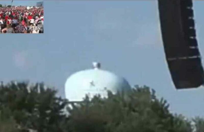 Hier is de video met linksboven een overlay van de Trump bijeenkomst. Helemaal bovenaan de watertoren is een kleinere, ronde structuur in het midden van de top van de toren. Je ziet een schimmige figuur verschijnen aan de rechterkant van die kleine ronde structuur in het midden bovenaan de watertoren, seconden voordat het schieten begon: