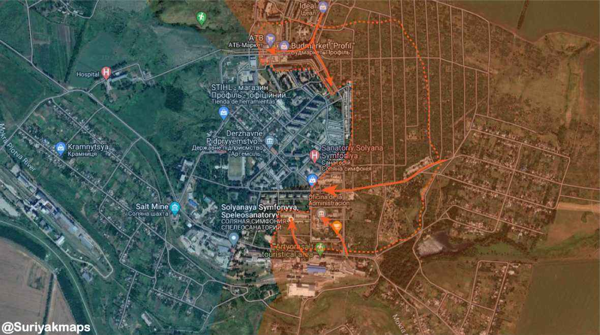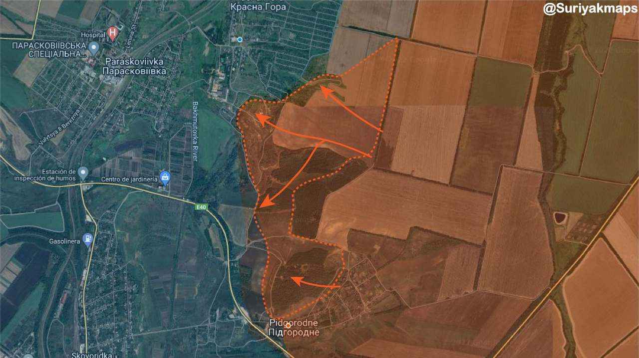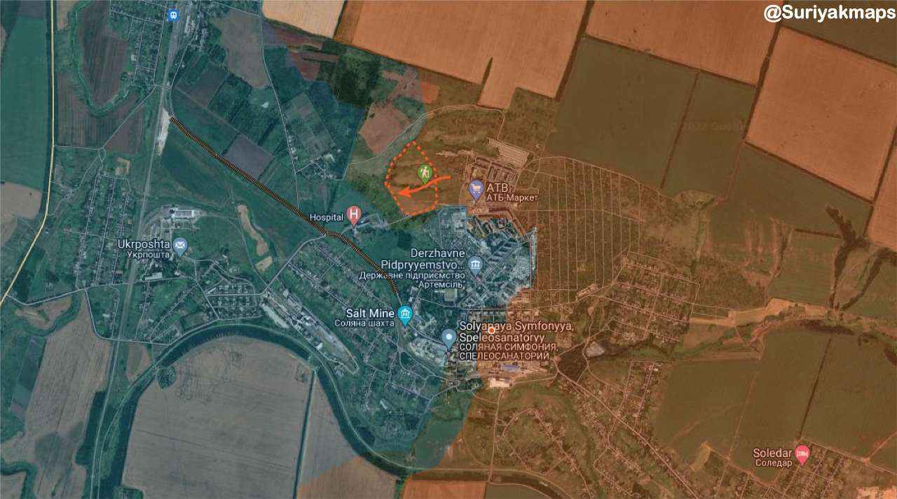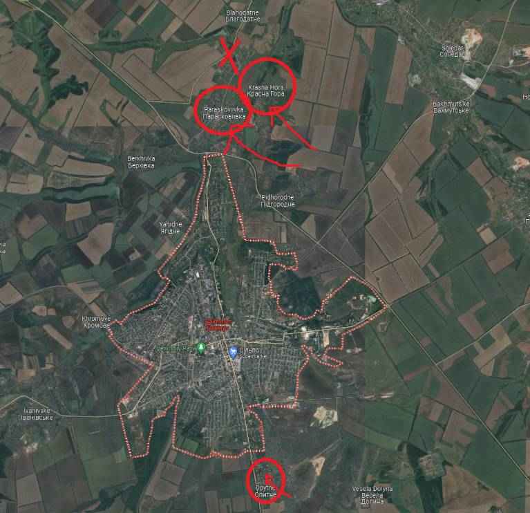 Ten noorden van Bakhmut stelden Russische troepen de heuvel naast Pidgorodne/Підгородне veilig en namen ze de controle over de noordelijke heuvels met uitzicht op Krasna Hora/Красна Гора, waar de gevechten in het zuiden zijn begonnen.