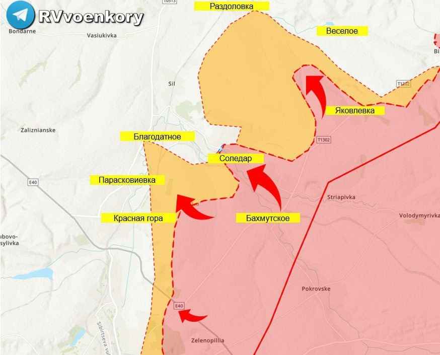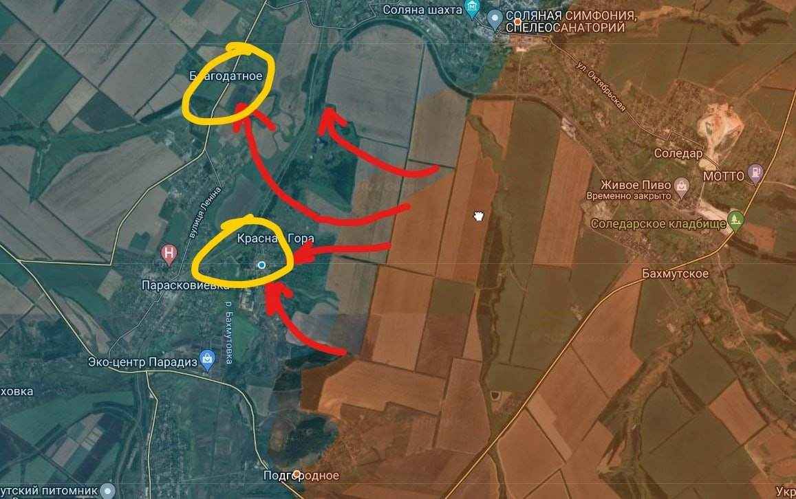 Russische troepen vechten met name in het dorp Paraskoveevka (Paraskovievka), waarlangs de groep in Soledar onlangs vanuit Konstantinovka werd bevoorraad.