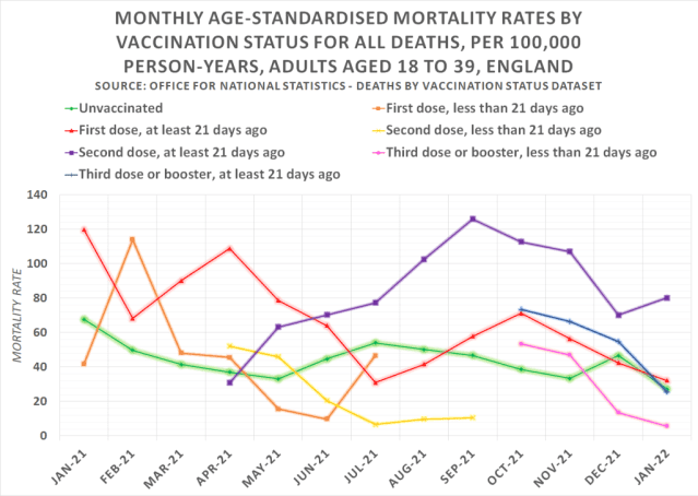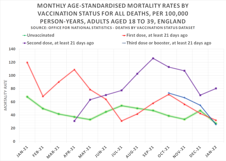 Intussen blijkt uit door het Office for National Statistics gepubliceerde gegevens dat tussen januari 2021 en januari 2022 dubbel gevaccineerde 18- tot 39-jarigen in Engeland gemiddeld 92% meer kans hadden om te sterven dan ongevaccineerde jongvolwassenen van dezelfde leeftijd.