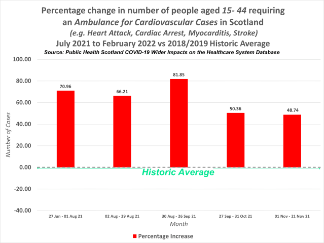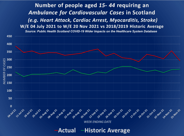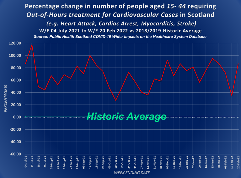 Uit officiële cijfers blijkt dat het aantal mensen tussen 15 en 44 jaar met hartaanvallen, hartstilstand, myocarditis, beroertes en andere hart- en vaatziekten met 67% is gestegen ten opzichte van het historisch gemiddelde, sinds deze leeftijdsgroep in Schotland voor het eerst de Covid-19 injectie kreeg, bericht Expose-news.com.